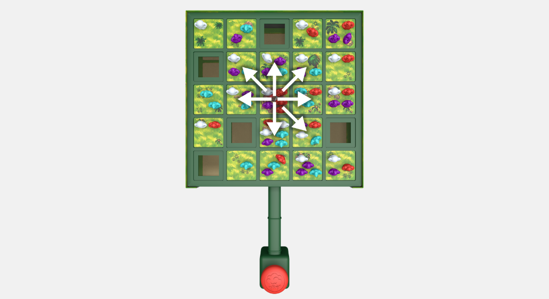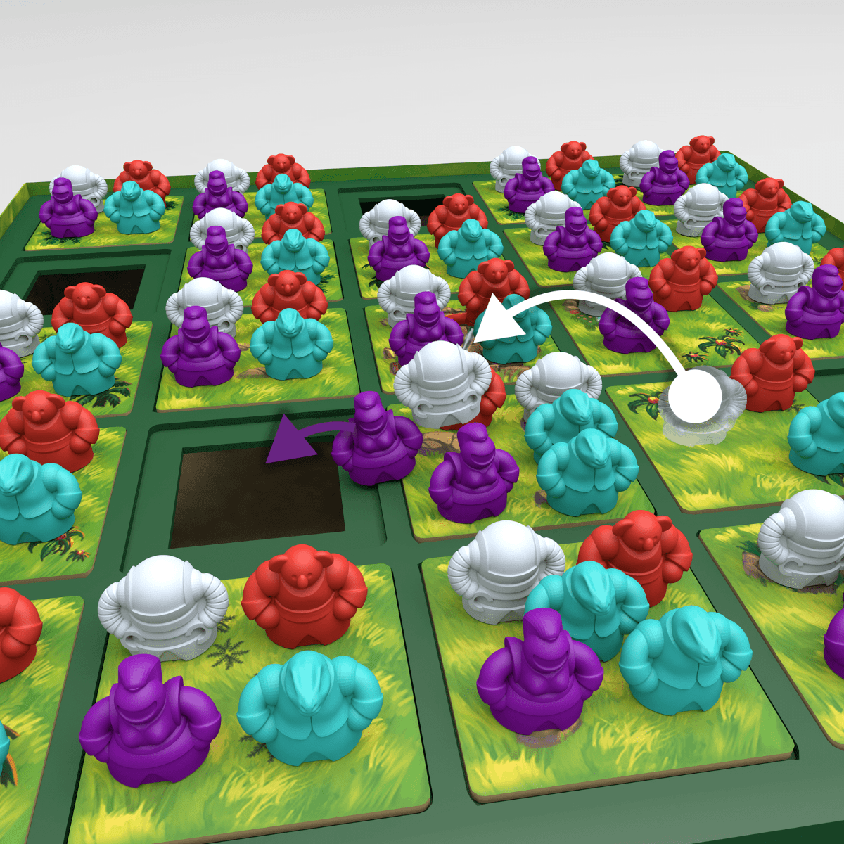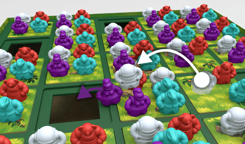 Als jouw krijger tijdens jouw beurt op een volle tegel eindigt, moet je 1 van de daar al aanwezige krijgers naar de volgende tegel duwen in dezelfde richting als jouw krijger opging.